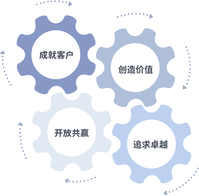 成就客户是一切决策的出发点,,,,创造价值是衡量所有工作的标准,,,追求卓越是我们做事做人的态度,,,,开放共赢是我们的格局也是最终的结果。。。。价值观的齿轮环环相扣,,,推动着组织里的每个人不断向前。。。。